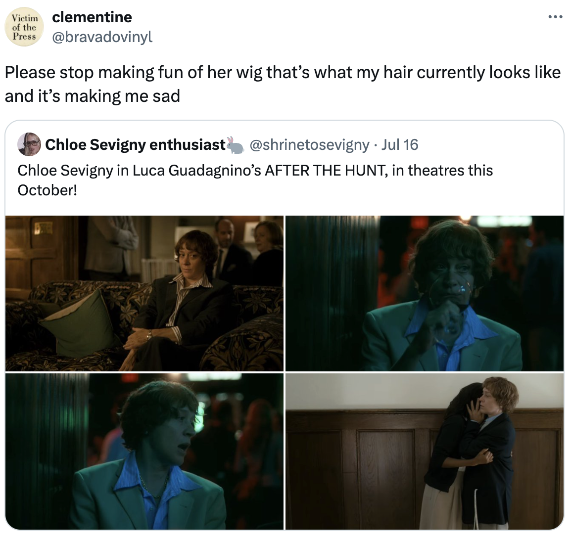 The movie is not a comedy (despite that nonbinary group-assault scene), but I found myself uncontrollably laughing anytime Chloë Sevigny appeared on screen. She really put on an oversized suit, slapped a Party City Ringo Starr wig on her head, and showed up on set ready to go. It's insane! (Although now that I think of it, she did look like a woman who regularly takes to the wharf.)