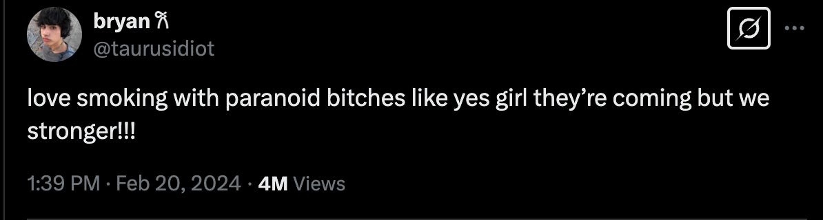 I don’t think we should be allowed to have such beautiful weather when such horrible shit is happening all the time. It’s real “Springtime for Hitler” vibes right now. Walking around the city, feeling the sun on your skin for the first time in forever, wearing a light jacket, smiling at dogs, and then you check your phone and it’s like: all cancer drugs are banned and we just killed 500 more Palestinian babies and we’re filling up our shiny new Salvadoran concentration camp with whoever the goons can grab off the street. It’s all so, so, so bad, and it makes me irrationally mad that the evil people get to enjoy this weather too (but do they even enjoy things like “sunlight” and “warmth”? Or does it annoy them in an opposite way from me, the thought that poor people might be out there enjoying sunshine as well?). Anyway, let’s hurry things up and ship all these freaks up to Mars or wherever they want to go, so the rest of us can start making life pleasant again here.
