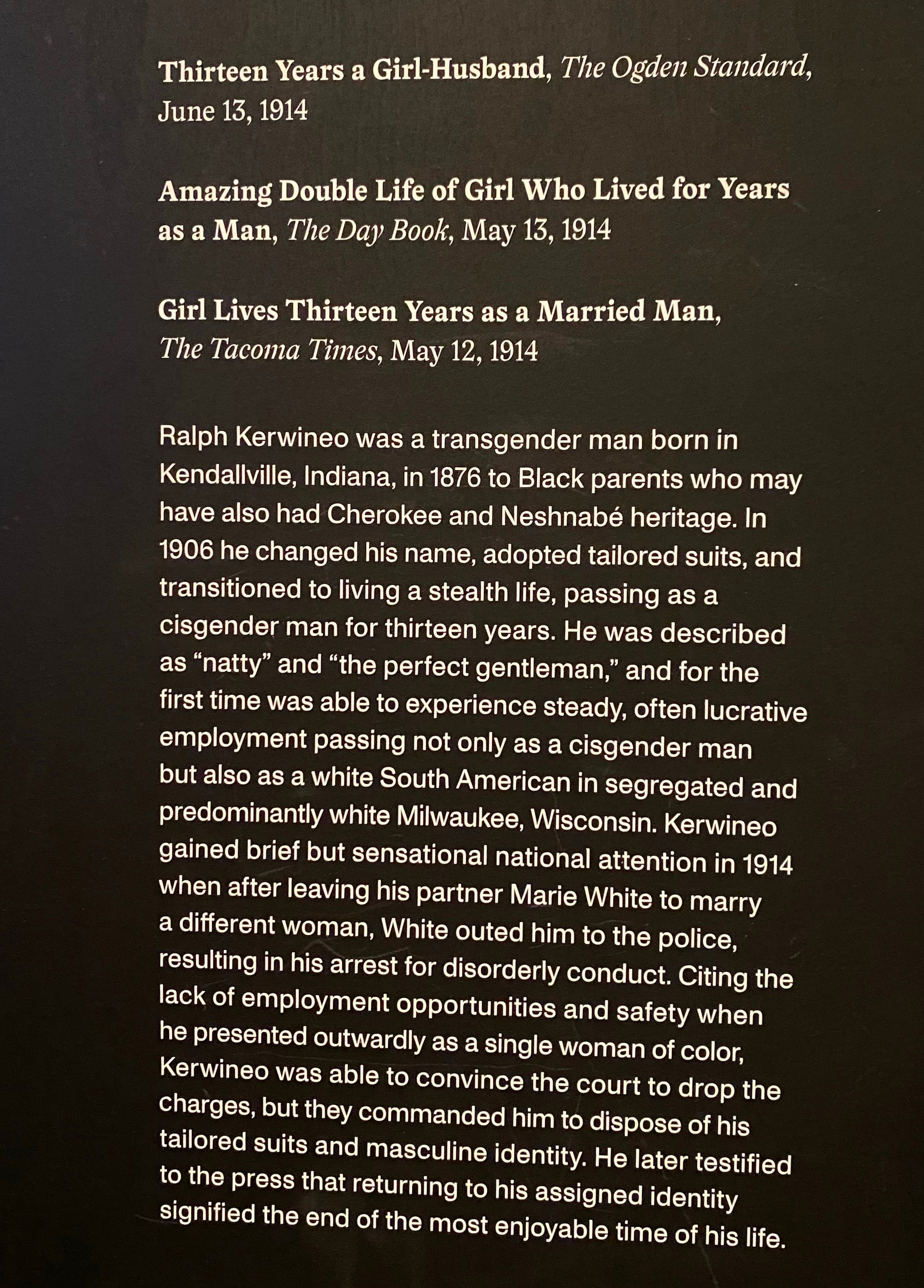 Down the hall from the Sargent exhibition was the Black tailoring exhibition from this year’s Met Gala, which was absolutely packed with people, but from what I could see, I enjoyed it! It was more historical than I expected (he says, about a museum exhibition), and I found the sections from the mid- to late-1800s fascinating, particularly around the way Black fashion evolved in response to slavery and emancipation. Also, I need a full book written about this trans man, STAT: