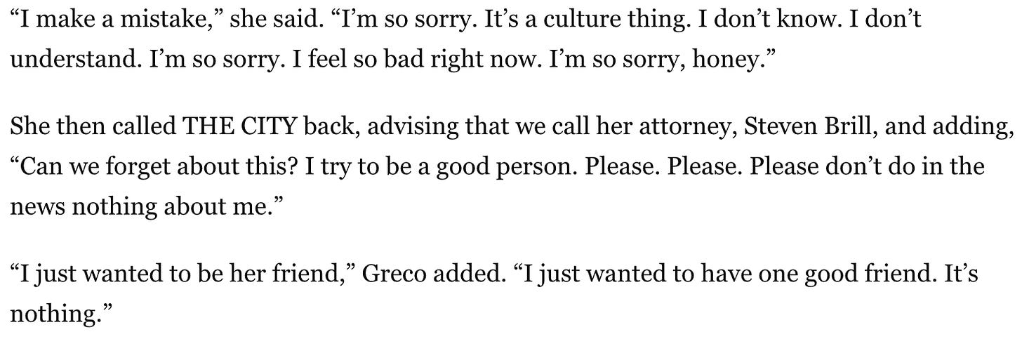 Am I sick or am I now feeling... kind of bad for Winnie??? “I just wanted to have one good friend,” is an all-timer political quote, one that I know is going to keep popping up in my head for decades, but I also love “Please don’t do in the news nothing about me.” This whole story is so pathetic, so awkward, so baffling, and so perfect. Greatest fucking city in the world, baby!!!! They should extend the mayoral race to run until November 2026, just for the laughs.